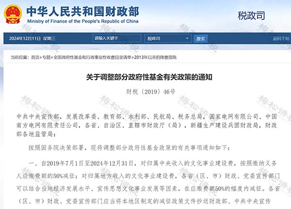 政策要點:自2019年7月1日至2024年12月31日,對歸屬中央收入的文化事業(yè)建設費,按照繳納義務人應繳費額的50%減征;對歸屬地方收入的文化事業(yè)建設費,各?。▍^(qū)、市)財政、黨委宣傳部門可以結合當?shù)亟?jīng)濟發(fā)展水平、宣傳思想文化事業(yè)發(fā)展等因素,在應繳費額50%的幅度內(nèi)減征。