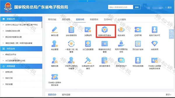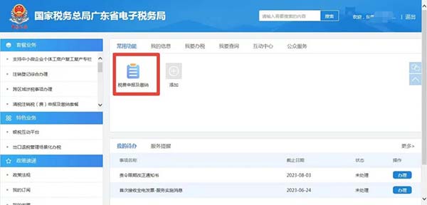 納稅人可登錄電子稅務局,點擊首頁左邊“常用功能—稅費申報及繳納”模塊,或點擊“我要辦稅—稅費申報及繳納”。