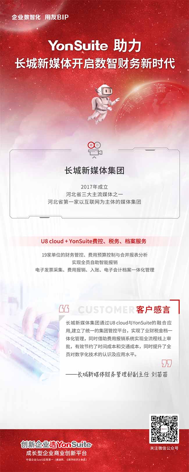 長城新媒體集團是一家新型多媒體信息服務公司,企業(yè)信息化建設意識超前,一直以來以財務牽頭逐步推動公司內(nèi)部管理信息化建設。本次采用用友 U8 cloud+YonSuite 費控、稅務、檔案服務利用云 + 端產(chǎn)品優(yōu)勢,借助河北省推動電子會計檔案試點單位建設的契機,以用友產(chǎn)品多組織集團財務管控平臺和 YonSuite 費用全員報銷、電子發(fā)票自動查重驗偽、智能填單、一鍵歸檔的產(chǎn)品特點助力長城新媒體集團數(shù)值化轉型邁上了新的臺階。
