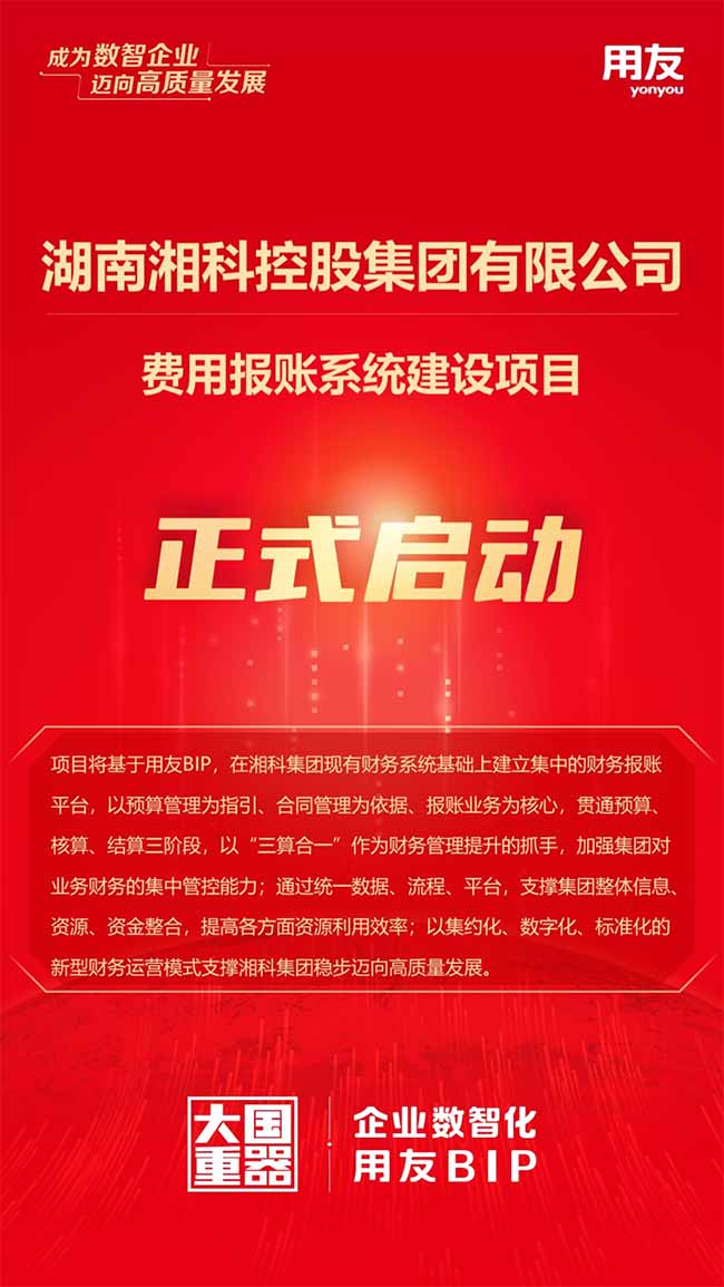 “十四五”時(shí)期是湘科集團(tuán)全面推動高質(zhì)量發(fā)展的關(guān)鍵期。湘科集團(tuán)積極貫徹落實(shí)國務(wù)院、國資委提出的“加快推進(jìn)國有企業(yè)數(shù)字化轉(zhuǎn)型”要求,攜手用友開啟財(cái)務(wù)數(shù)智化建設(shè)新征程,以財(cái)務(wù)數(shù)智化牽引集團(tuán)整體數(shù)智化,支撐企業(yè)在新時(shí)期做優(yōu)做大做強(qiáng)。