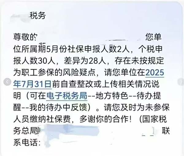 您單位所屬期5月份社保申報人數(shù)2人,個稅申報人數(shù)30人,差異28人,存在未按規(guī)定為職工參保的風(fēng)險疑點,請您單位在2025年7月31日前自查整改或上傳相關(guān)情況說明。請您及時為參保人員繳納社保費,多謝你的合作!”